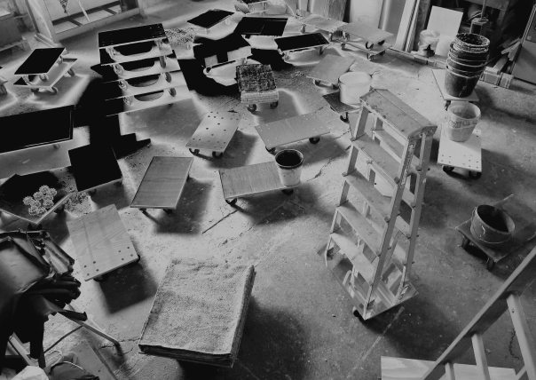 In dem ersten Raum stehen 50 Rollhunde, mit deren Hilfe üblicherweise Möbel verrückt werden. Katharina Hohmann hat sie in der Installation Vehicula übereinander gestapelt und nebeneinander arrangiert. Auf manchen stehen mit Wasser gefüllte Eimer, liegen gefaltete Umzugsdecken oder flache, kreisrunde Spiegel. Entgegen ihrer ursprünglichen Funktion zwingt sie der Balanceakt in eine absolute Starre. Bei der kleinsten Bewegung droht das Wasser im Eimer überzulaufen, der Turm zu zerfallen. Bewegung ist impliziert, doch gleichzeitig unmöglich. Parallel dazu evozieren die übereinander gestapelten Rollhunde die Vorstellung unterschiedlich hoch aufwachsender Architekturen. Besonders wirkungsvoll ist in dieser Hinsicht die „Säule“ die man zu sehen meint, wenn in der Mitte auf jedem der übereinander gestapelten Hunde ein Spiegel liegt.